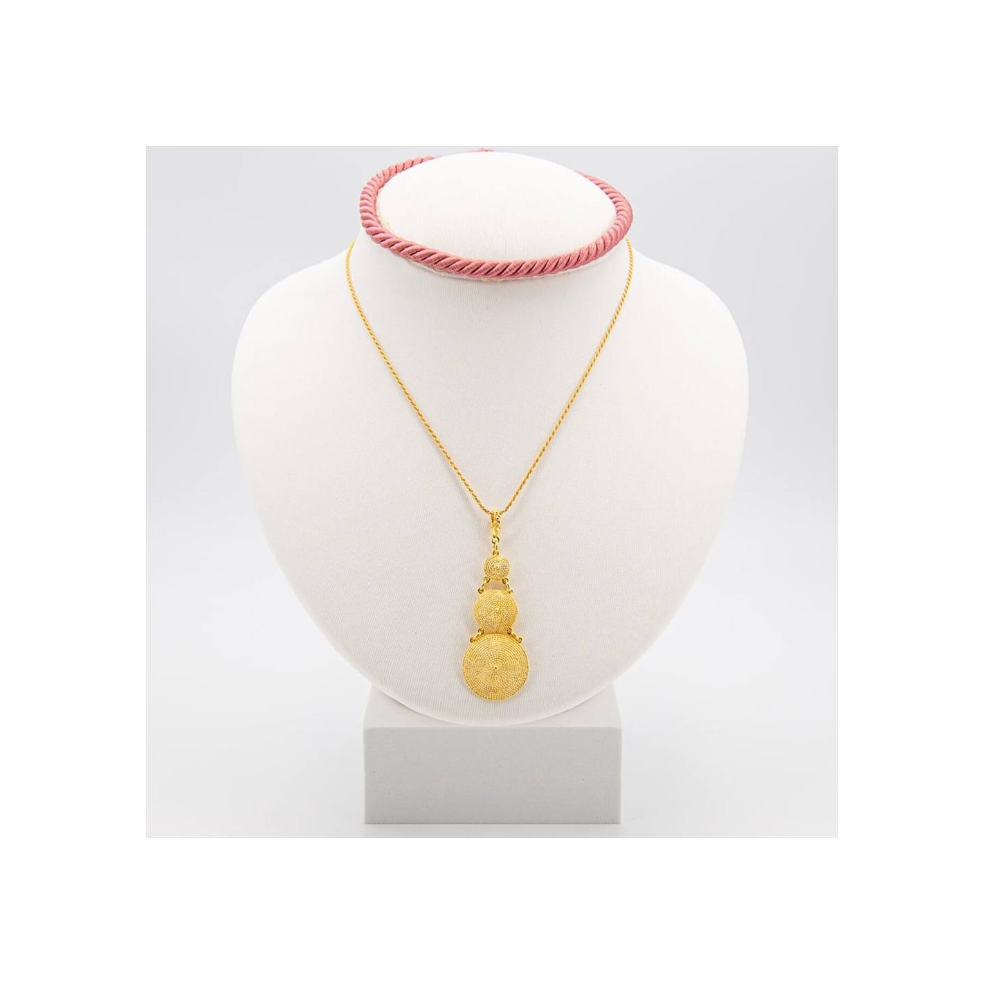 Collana pendente Sa Corbula in argento 925/ooo dorato forgiato con tre elementi disgiunti a scalare: Altezza pendente cm.6,5 - Diametro prima corbula o,9 mm - Diametro corbula centrale 1,5 cm - Diametro corbula finale cm. 2,25 cm. Lunghezza collana roll cm.50.