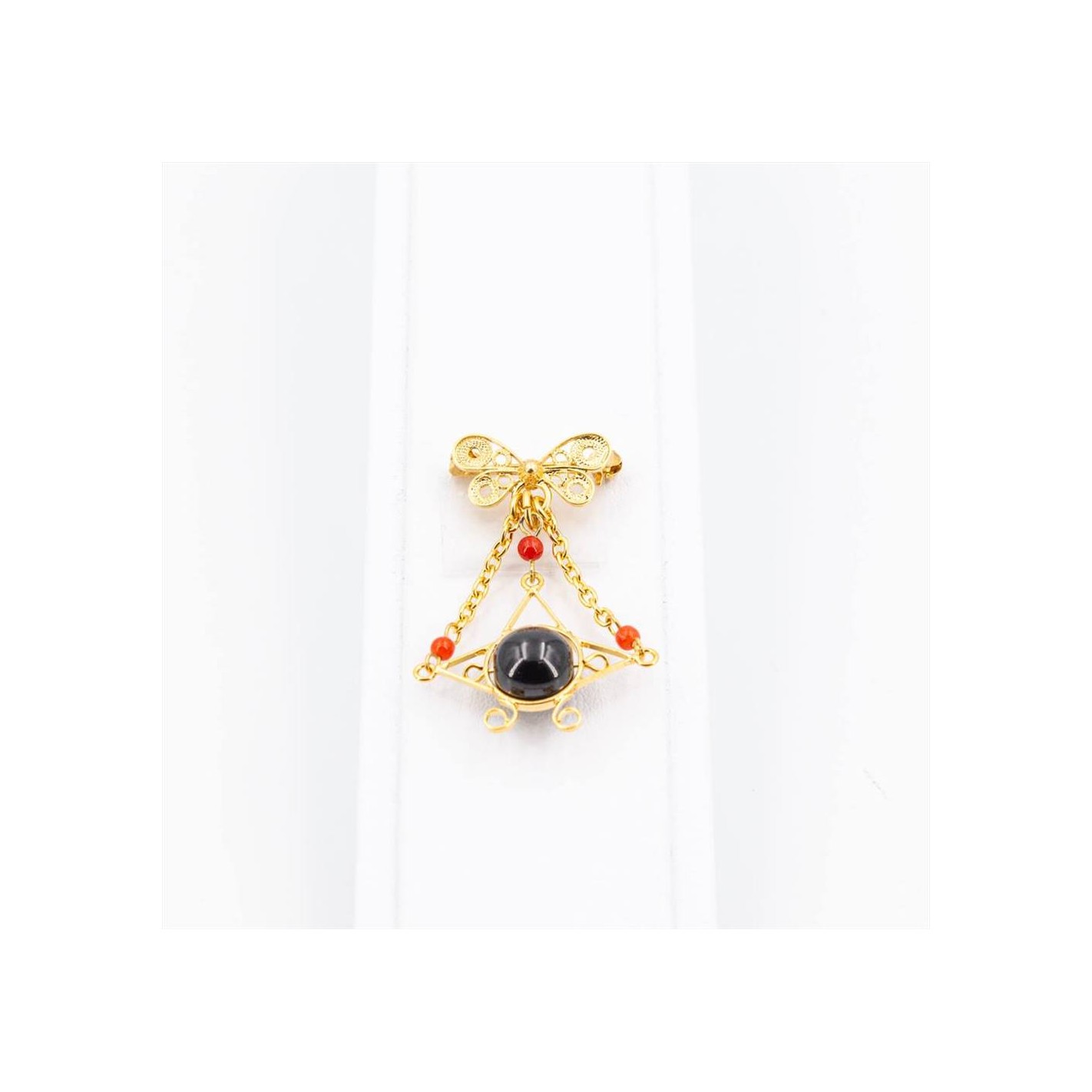 Spilla Culla Amuleto Su Coccu Argento Dorato Sfera Onice e Corallini